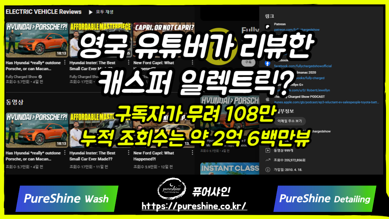캐스퍼 일렉트릭이 해외에서 많은 영향력을 가졌는지 알 수 있었던 영상이 있었어요!영국에서 엄청나게 유명한 리뷰어(유튜버)가 캐스퍼 일렉트릭을 리뷰하면서 극찬을 아끼지 않았거든요.👍이 유튜버는 구독자가 무려 108만에 누적 조회수는 약 2억 6백만뷰를 가진 유튜버에요!